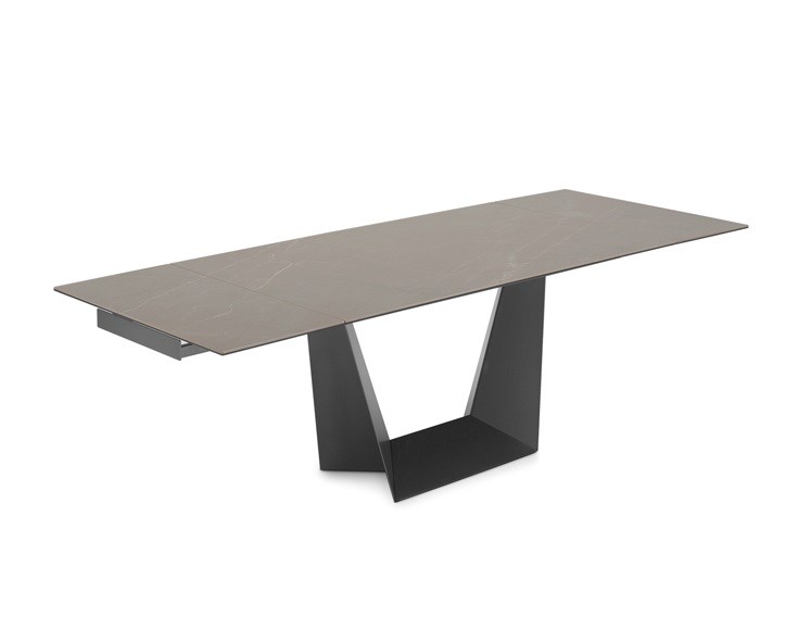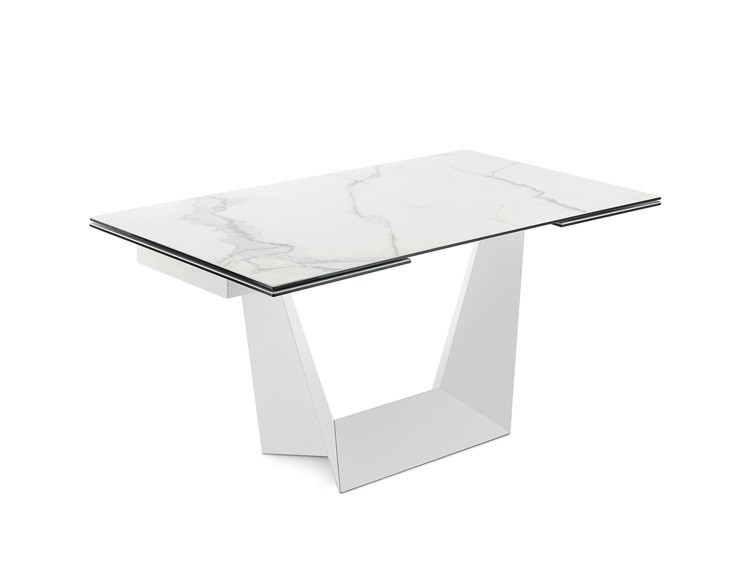 Tavolo rettangolare allungabile. Struttura in acciaio laccato, piano e allunghe in vetro temprato o ceramica.
